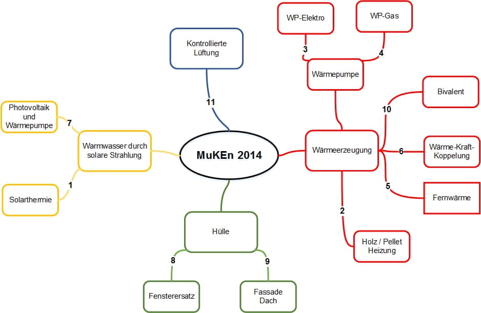 Wird die Wärmeerzeugung auf erneuerbare Energieträger umgestellt, kann aus den in der Grafik bezeichneten Technologien ausgewählt werden.