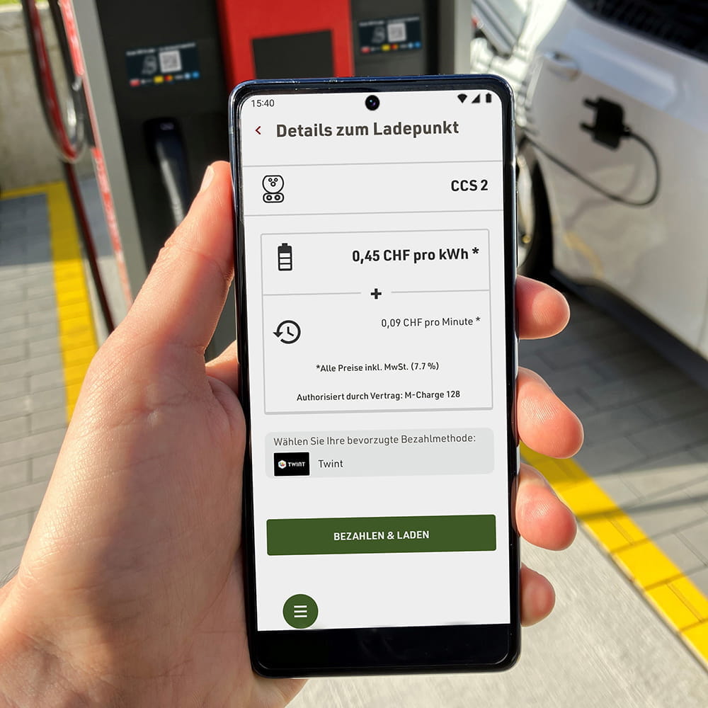 - QR-Code am Stecker scannen, Website öffnen, Zahlungsmittel wählen, auf «Bezahlen & Laden» klicken.