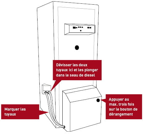 Comme solution d’urgence, il est possible, dans la plupart des cas, d’utiliser provisoirement du diesel en attendant la livraison de mazout de chauffage. La procédure est la suivante:- Remplir un seau de diesel à la station-service la plus proche. Important: il ne faut utiliser que du diesel! On ne peut en aucun cas utiliser de l’essence.