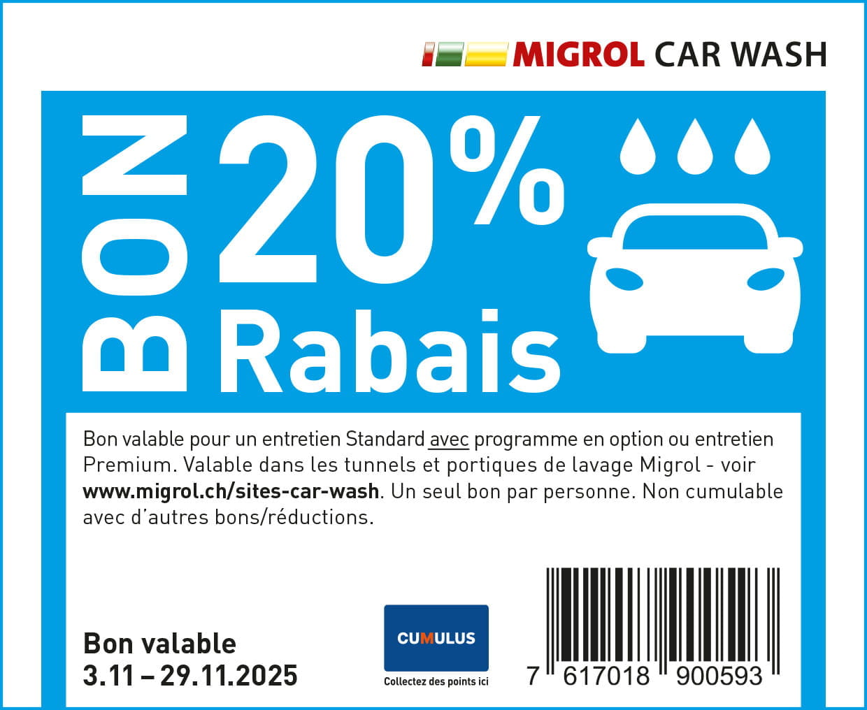 Vous pouvez utiliser le bon dans nos stations Migrol Car Wash jusqu'au 29.11.2025.