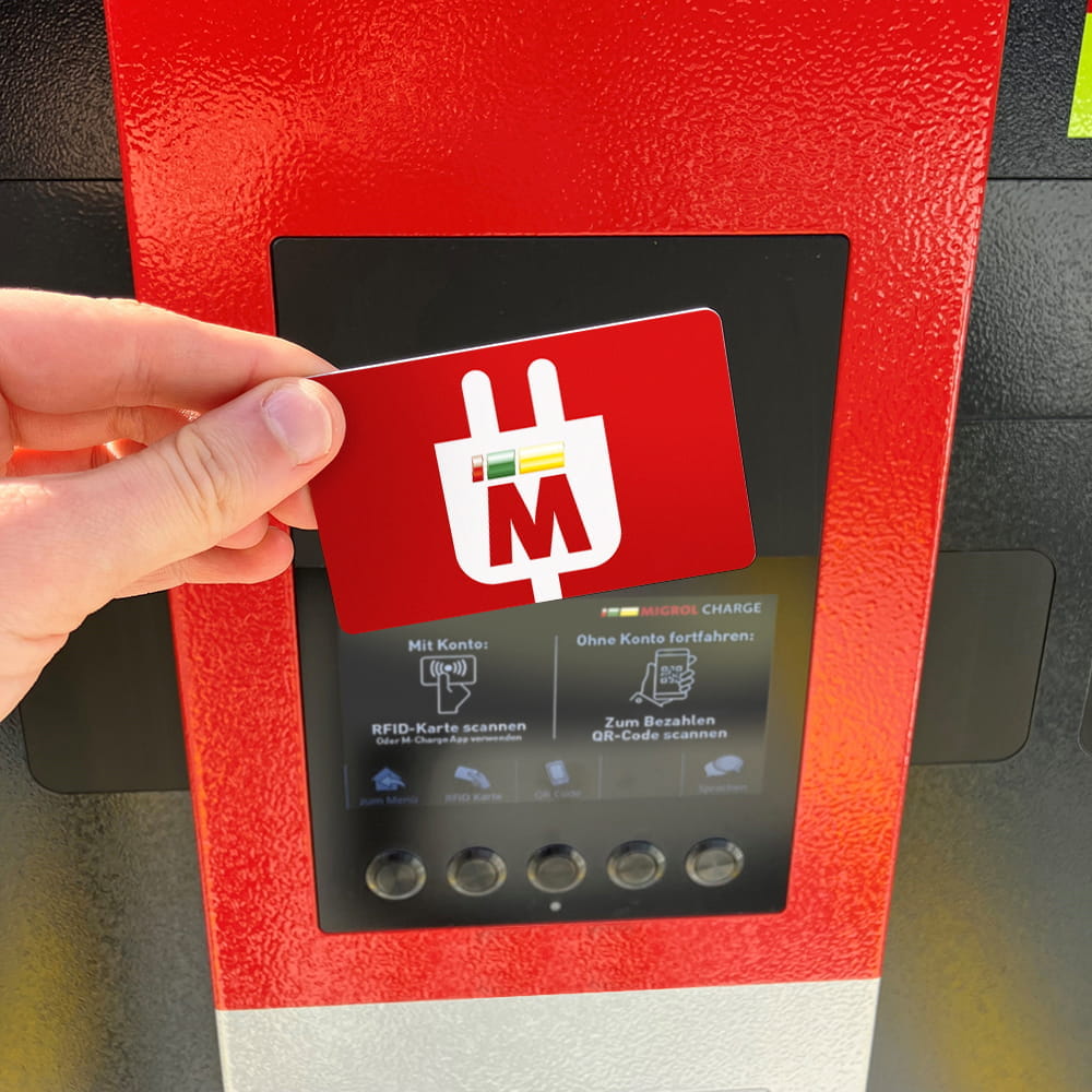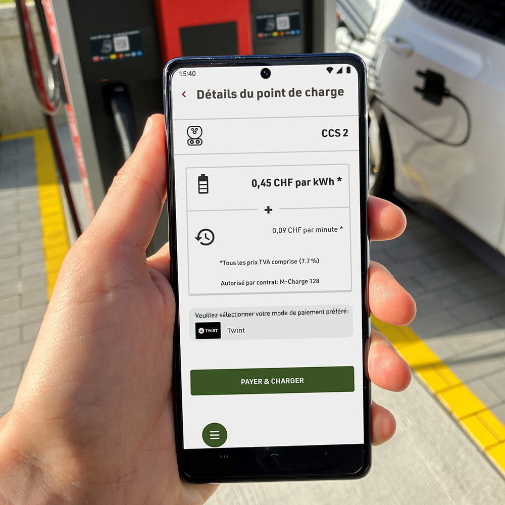 Des bornes de recharge rapide DC en courant continu fournissant une puissance allant jusqu’à 320 kW sont disponibles dans des sites Migrol sélectionnés à haute fréquentation. Vous n’êtes pas pressés? Alors profitez-en pour recharger votre véhicule électrique à l'avenir, à plus de 2’000 points de recharge Migros pendant que vous effectuez vos courses de la semaine – avec une puissance de charge allant jusqu’à 60 kW en courant continu DC ou 22 kW en courant alternatif AC.
