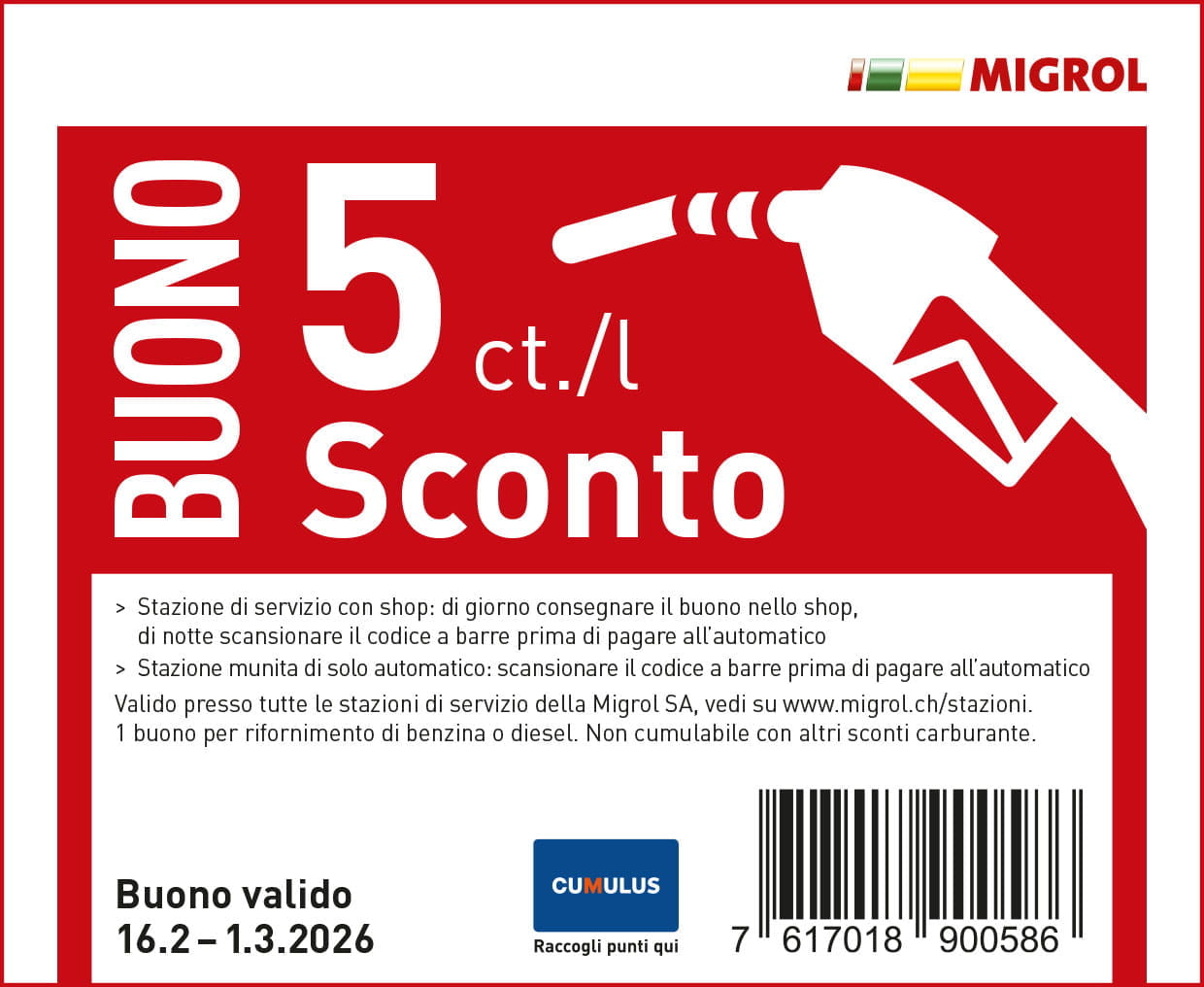 Approfitti di uno sconto di 5 ct./l al rifornimento di benzina o diesel presso tutte le stazioni di servizio munite di shop e le stazioni di servizio dotate di solo automatico della Migrol SA, vedi www.migrol.ch/stazioni fino al 1.3.2026.