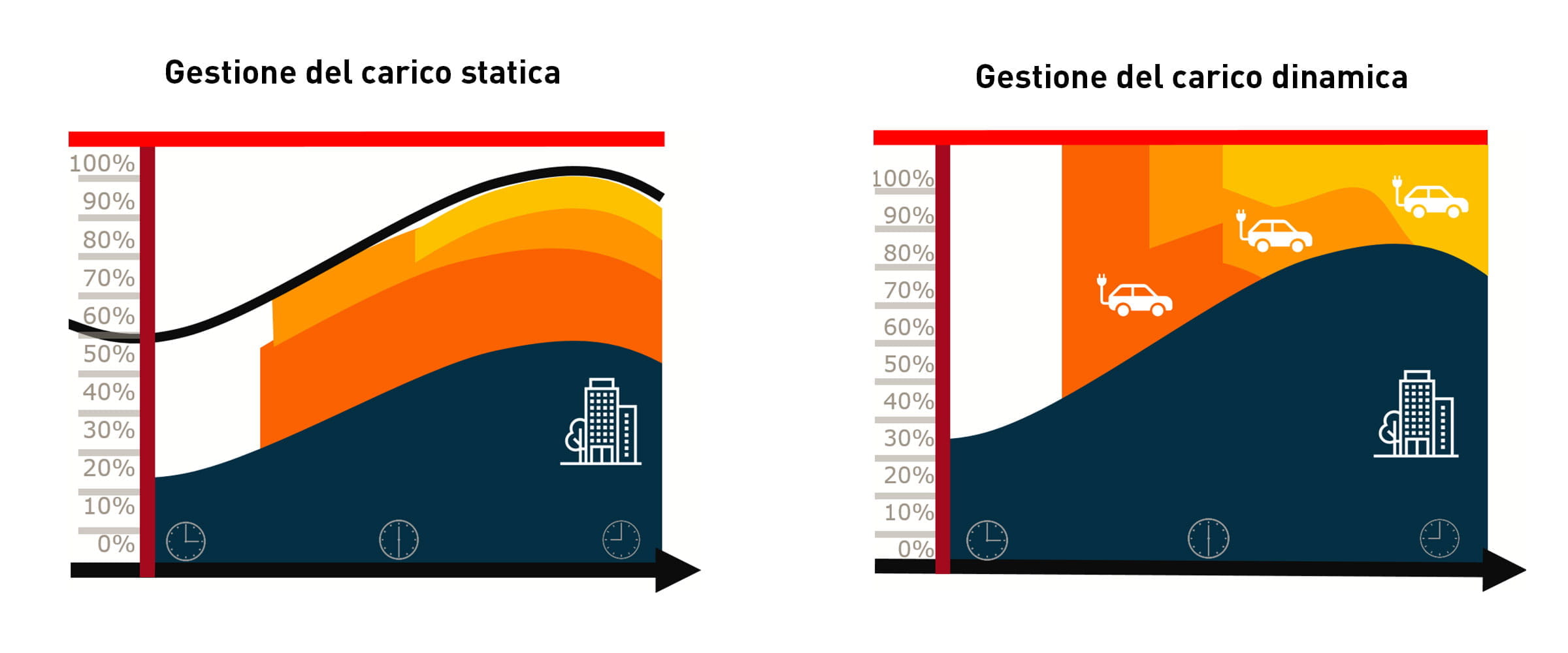 In una gestione del carico dinamica viene misurato il consumo energetico attuale dell’edificio. La potenza non sfruttata nell’edificio può essere usata per ricaricare le auto elettriche e viene adeguata ogni secondo. Il collegamento alla rete viene sfruttato in modo ottimale senza superare il massimo. La gestione del carico dinamica è chiaramente più flessibile ed è adatta ad es. a grandi complessi residenziali o edifici adibiti a uffici.